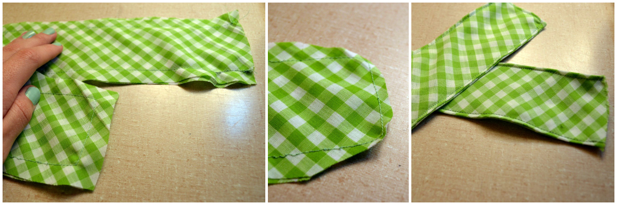 Assemble the straps by sewing three sides at .5″ right sides together. Trim corners.
